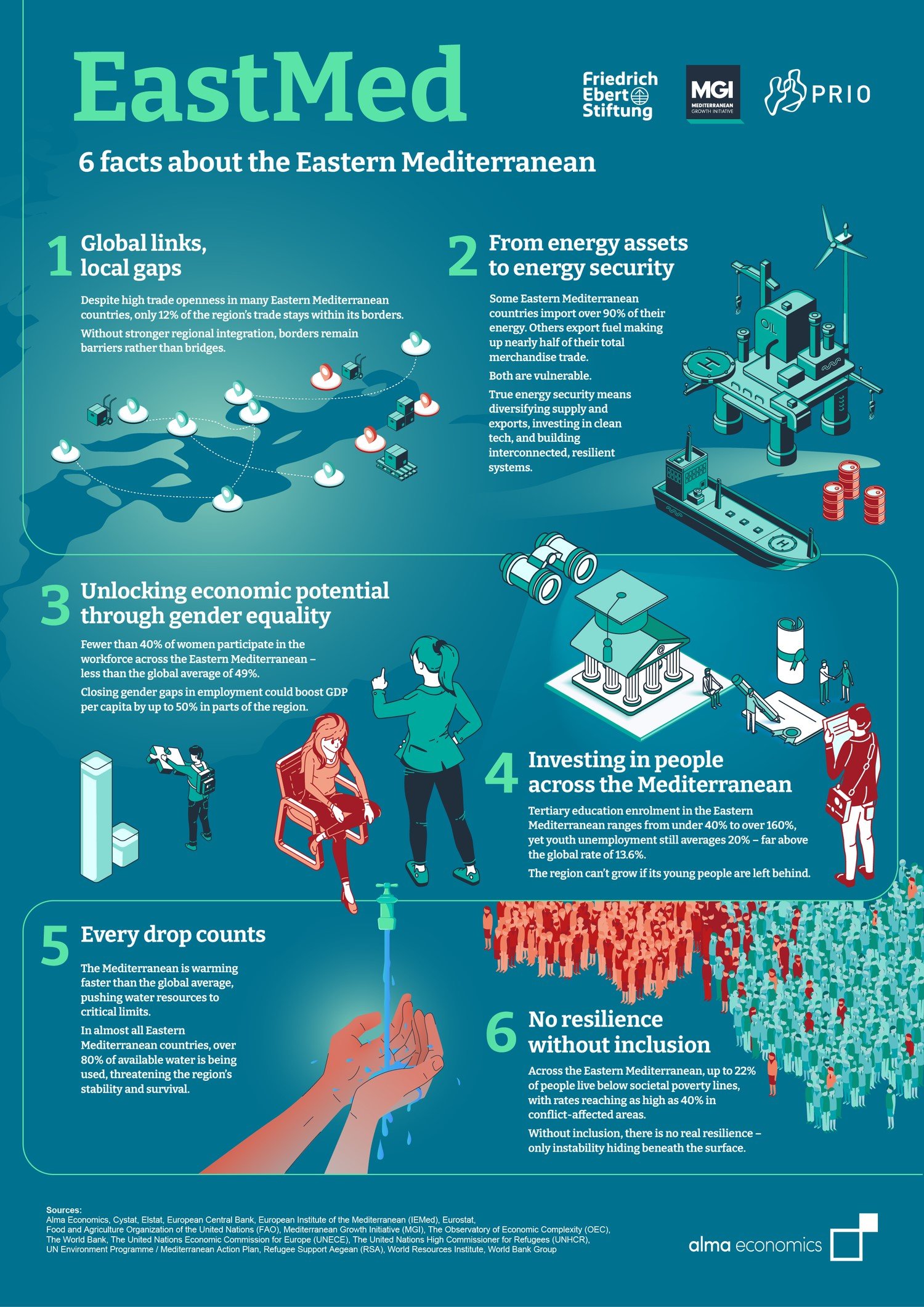 A new report, "6 Facts About the Eastern Mediterranean," produced by Alma Economics, sheds light on the region’s interconnected dynamics, emphasizing the need for cooperation, inclusion, and bold investments in people and systems.